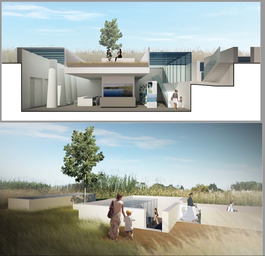 Sarà una struttura ipogea coperta da un tetto verde con vegetazione spontanea e vetrate fotovoltaiche per un’illuminazione naturale e sostenibile. Il centro sarà accessibile a persone con mobilità ridotta e dotato di un sistema di recupero delle acque piovane per usi interni. Inoltre, il centro promuoverà il turismo naturalistico attraverso servizi di noleggio di canoe e biciclette per una mobilità dolce.