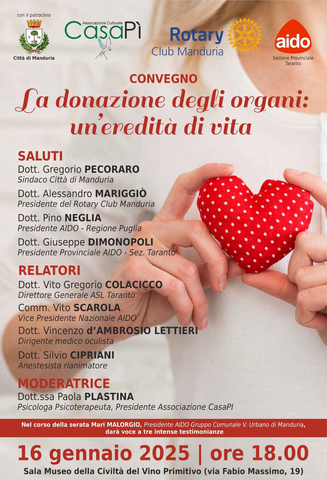 Giovedì 16 gennaio, alle ore 18, presso la sala museo della Civiltà del Vino Primitivo di Manduria (via F. Massimo 19), si terrà un convegno informativo dal titolo “La donazione degli organi: un’eredità di vita”.