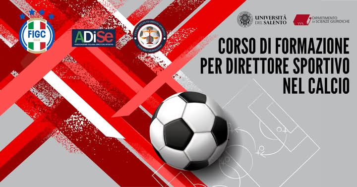 È in partenza la nuova edizione del Ccrso di formazione per Direttore Sportivo nel calcio, organizzato dal Dipartimento di Scienze Giuridiche - UniSalento, accreditato dalla FIGC Federazione Italiana Giuoco Calcio e patrocinato ADISE. La frequenza del corso consente di sostenere l’esame di abilitazione FIGC.