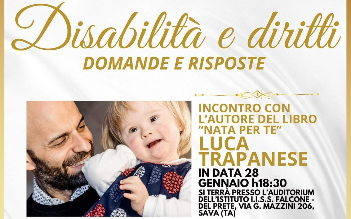 Lo scrittore e attivista per i diritti dei disabili, padre single di una bambina down, Luca Trapanese, incontrerà i ragazzi e le famiglie del territorio per promuovere, incoraggiare e sviluppare nelle giovani generazioni, il senso civico e il rispetto dei diritti dei disabili per una società più accogliente ed inclusiva
