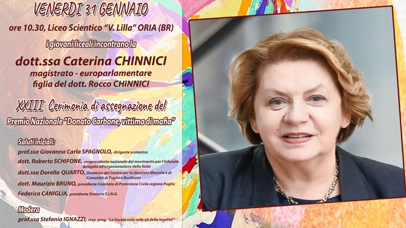 Il 31 gennaio, alle ore 10.30, la dott.ssa Caterina Chinnici incontrerà i giovani del liceo scientifico di Oria: all’europarlamentare sarà assegnato il premio nazionale “Donato Carbone – vittima di mafia” giunto alle sua XXIII edizione. Il premio è stato pensato nel 2002 in memoria di un giovane oritano ucciso durante una rapina, è assegnato a personaggi e organizzazioni operanti nell’educazione, l’animazione, e la salvezza fisica e morale dei bambini, ragazzi e giovani, a chi è impegnato nella diffusione di tematiche legate all’antimafia ed alla Pace. Il premio sarà consegnato, a nome del S.I.N.G., dalla dott.ssa Dorella Quarto direttrice del Centro per la Giustizia minorile e di Comunità di Puglia e Basilicata.