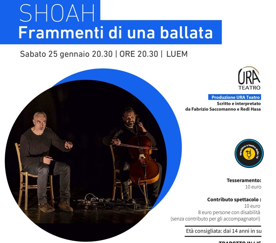Nell’ambito della rassegna di teatro accessibili “Aperta”, promossa da Movidabilia, presso lo spazio teatrale del Laboratorio Urbano ex Macello di Sava, sabato prossimo (25 gennaio), alle ore 20.30, si terrà lo spettacolo teatrale Shoah – frammenti di una ballata, scritto e interpretato da Fabrizio Saccomanno e Redi Hasa.