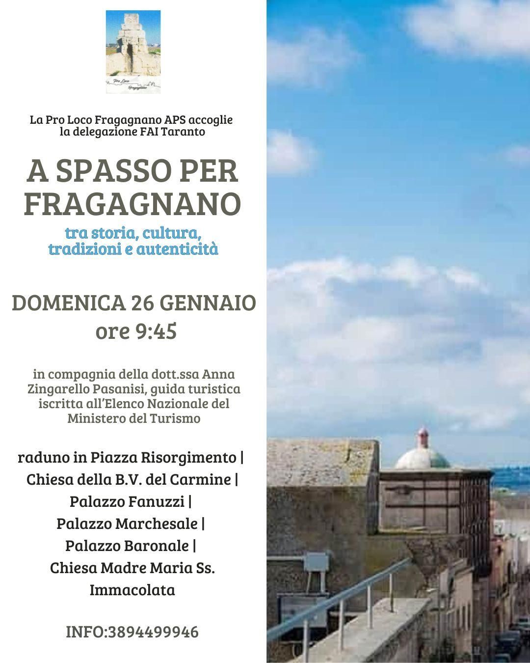 Domenica mattina, invece, la Pro Loco Fragagnano accoglierà la delegazione del FAI (Fondo per l’Ambiente Italiano) di Taranto per un evento speciale dedicato alla valorizzazione del proprio patrimonio storico e culturale. L’iniziativa, dal titolo “A spasso per Fragagnano: tra storia, cultura, tradizioni e autenticità”, sarà guidata dalla Anna Zingarello Pasanisi, guida turistica qualificata e iscritta all’Elenco Nazionale del Ministero del Turismo, che accompagnerà i visitatori in un percorso tra arte, storia e tradizioni locali.