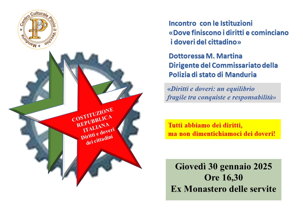 Giovedì 29 gennaio, alle ore 16,30, presso l’ex monastero delle Servite, nell’ambito del progetto “Incontro con le Istituzioni - Dove finiscono i diritti e cominciano i doveri del cittadino”, promosso dall’associazione culturale di formazione permanente “Plinio il Vecchio”, la dottoressa Marinella Martina, dirigente del Commissariato della Polizia di Stato di Manduria, tratterà il tema: “Diritti e doveri: un equilibrio fragile tra conquiste e responsabilità”.