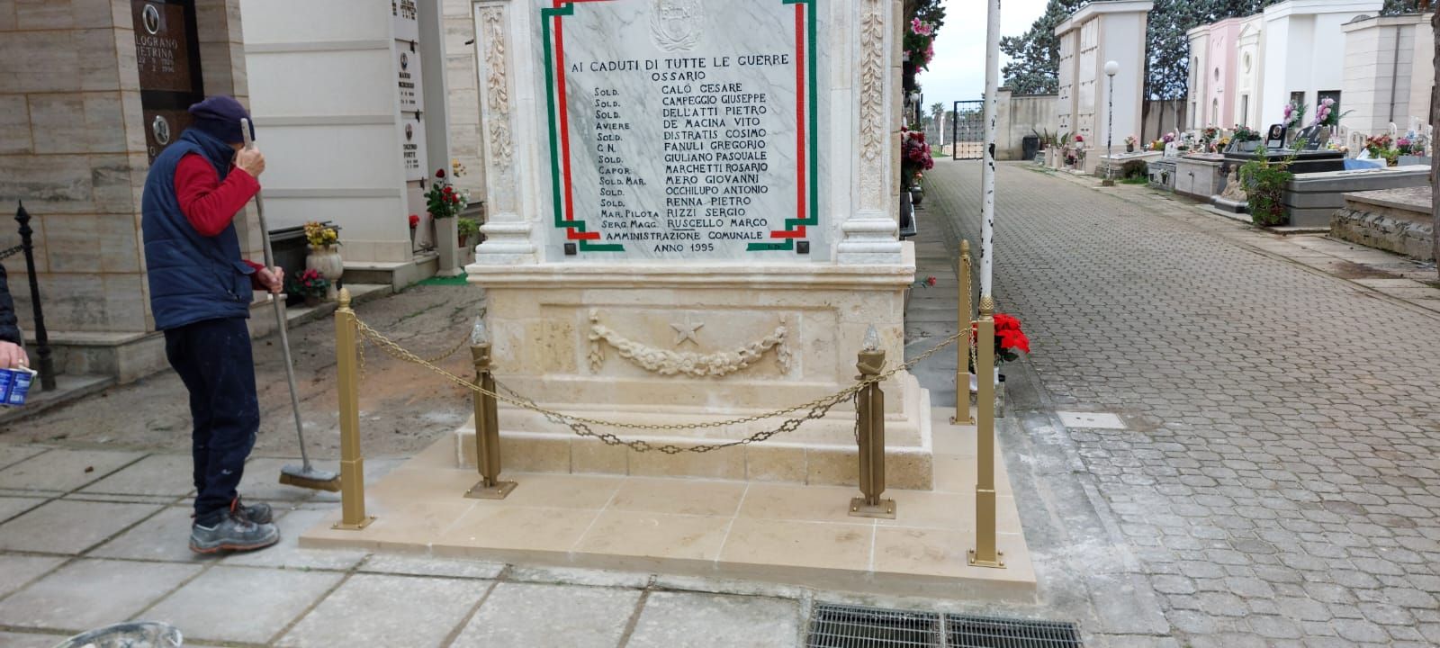 Continua il lavoro di manutenzione ordinaria: ormai siamo alle pulizie. A breve e grazie, all’intervento di Associazione Nazionale Sottufficiali d’Italia - Manduria e Associazione Nazionale Combattenti e Reduci, sezione di Manduria, sarà riconsegnato alla città la lapide ai Caduti presso il cimitero cittadino di Manduria, per onorare chi ha dato la propria vita per la Patria e le istituzioni.