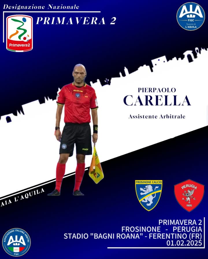 Pierpaolo Carella (AIA L’Aquila) designato come assistente dell’incontro fra Frosinone e Perugia inserito nel programma della prossima giornata del campionato Primavera 2.
