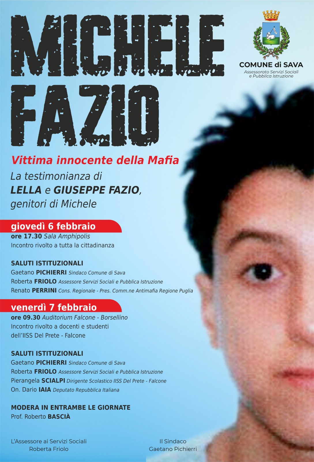 Sava ricorda Michele Fazio, vittima innocente di mafia. L’Amministrazione comunale ha promosso due incontri (6 e 7 febbraio) in cui saranno presenti i genitori di Michele, Lella e Giuseppe Fazio.