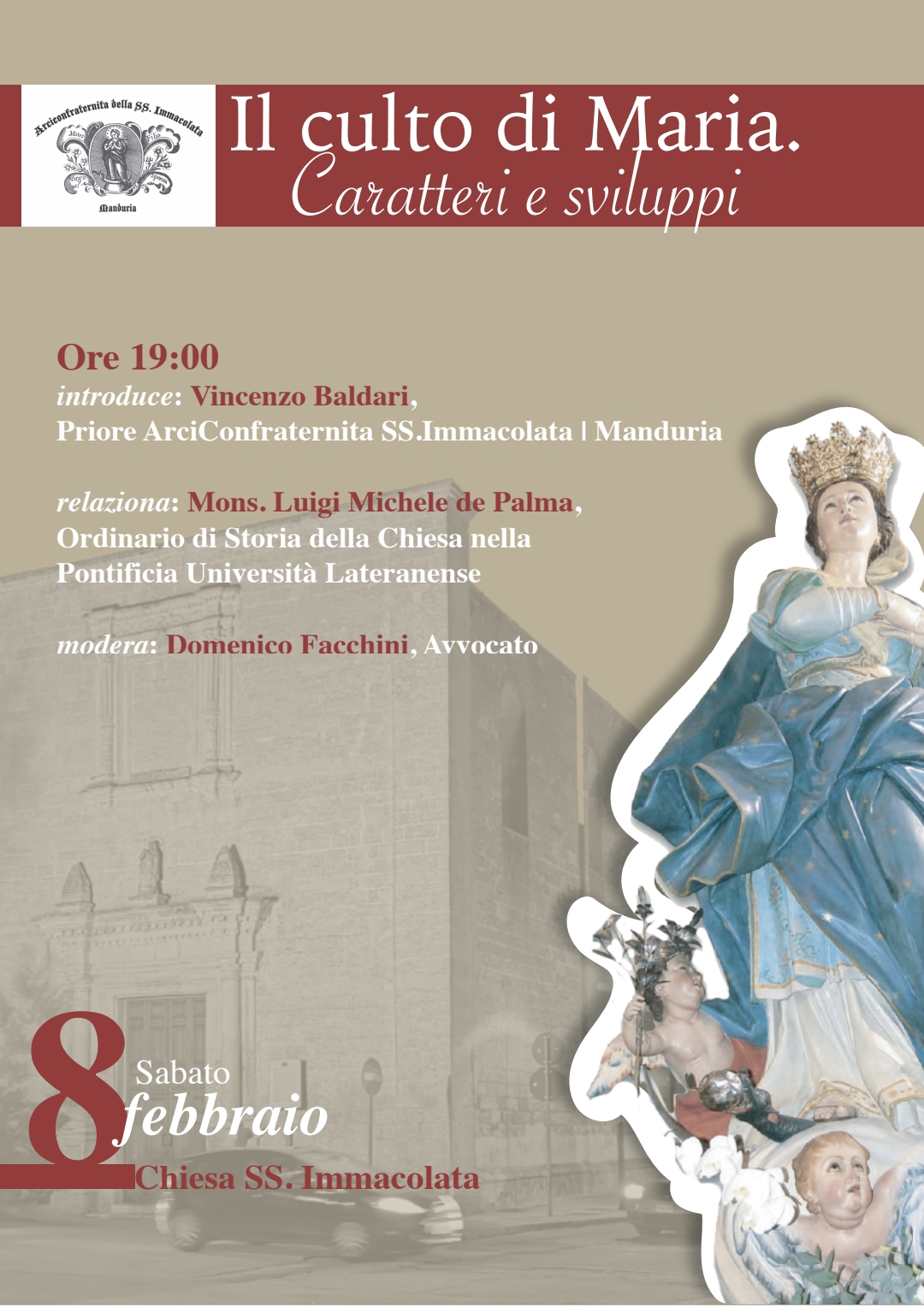 “Il culto di Maria – Caratteri e sviluppo”. E’ questo il tema di una conferenza che, su iniziativa della Confraternita dell'Immacolata di Manduria, si terrà sabato prossimo (8 febbraio) nella chiesa dell’Immacolata.