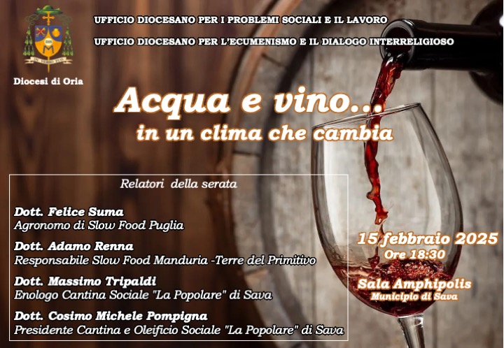 L’Ufficio per i Problemi sociali e il Lavoro e l’Ufficio per la Cooperazione missionaria tra le Chiese, Ecumenismo e Dialogo interreligioso della Diocesi di Oria presentano l’iniziativa “Acqua e vino… in un clima che cambia”, tavola rotonda con dibattito che si terrà sabato 15 febbraio, alle ore 18.30, nella sala “Amphipolis” del municipio di Sava.