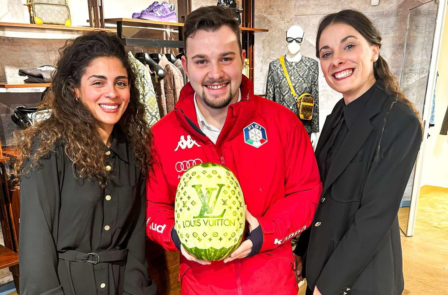 Giuseppe Guida ha realizzato, su un’anguria, il logo di Louis Vuitton e poi ha donato la sua opera d’arte allo store di questa esclusiva località turistica.