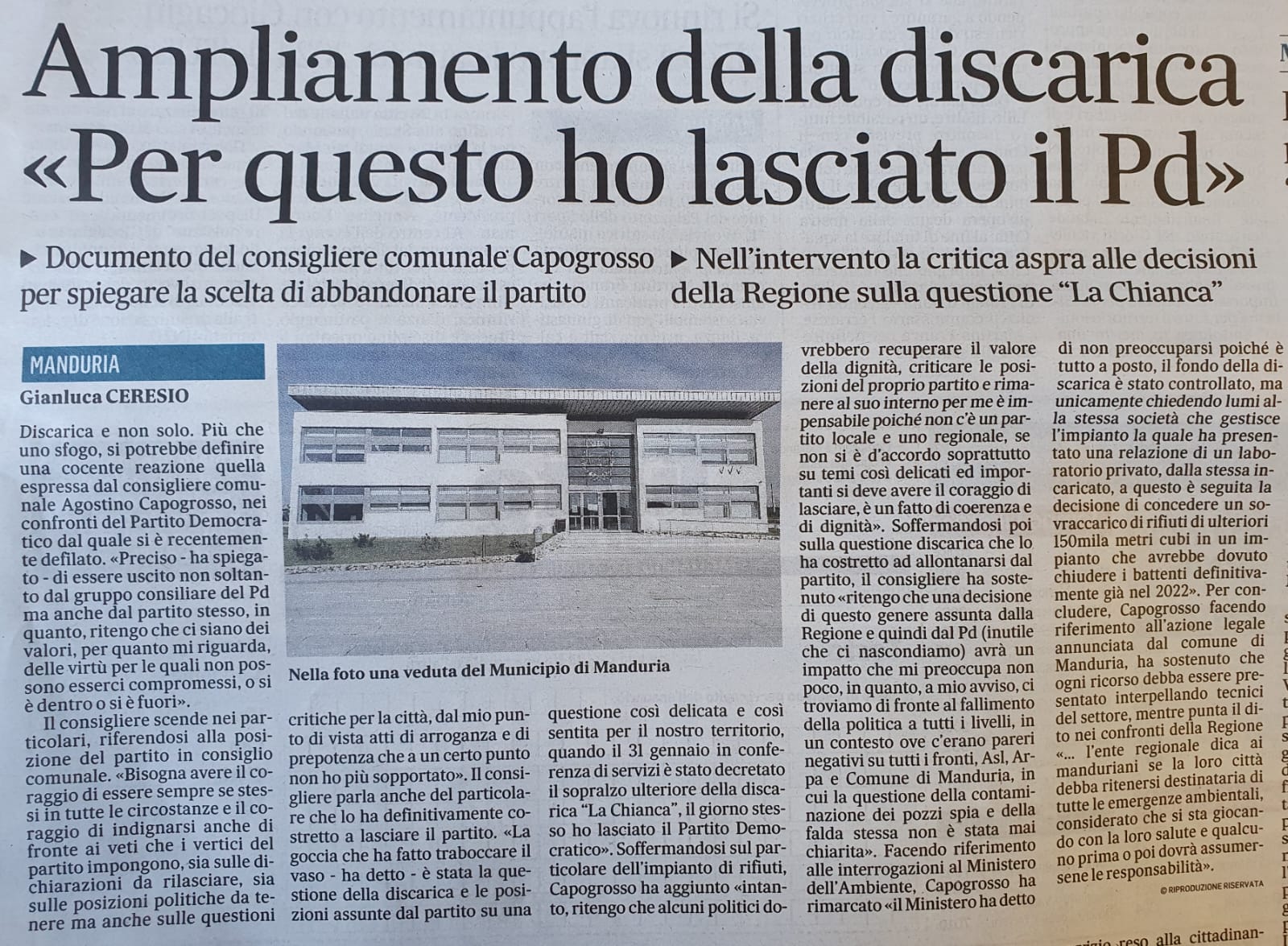 La politica che ci ha condannati a essere la pattumiera della Puglia era già pronta a tradirci ancora. Il mio abbandono del PD, ne fu la denuncia!