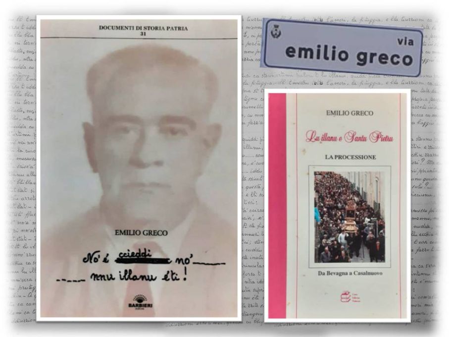 Una parte della produzione manoscritta di Emilio Greco ha preso forma, in anni a noi più vicini, in due opere a stampa: “Lu illanu e Santu Pietru. La processione da Bevagna a Casalnuovo” (Paolo Laurita Editore, Potenza 1995) e “No’ è ccieddi no’… nnu illanu èti” (Barbieri editore, Manduria 2011), che comprende anche il racconto relativo a San Pietro.