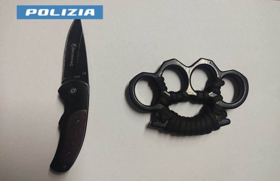 Supponendo che il ragazzo potesse tenere con sé quel cane anche per scongiurare volutamente un eventuale e più approfondito controllo, gli agenti, con le dovute cautele, dopo averlo identificato, hanno proceduto con una perquisizione personale che ha permesso di recuperare un “tirapugni”, dotato di un’impugnatura sempre in ferro e un coltello a serramanico a punta di colore nero con lama in ferro lunga cm. 6,5.