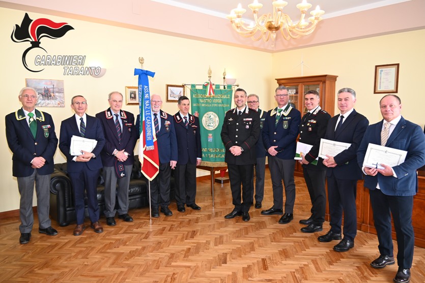 Nel corso di una sobria cerimonia, il Comandante Provinciale dei Carabinieri di Taranto, Colonnello Antonio Marinucci, alla presenza degli ufficiali del Comando Provinciale, di una rappresentanza dell'A.N.C. (Associazione Nazionale Carabinieri), dell'Associazione "Nastro Verde" e di sottufficiali e carabinieri della sede, ha voluto personalmente consegnare a quattro militari dell'Arma, in servizio e in congedo, i diplomi di conferimento della "Medaglia Mauriziana al merito di dieci lustri di carriera militare".