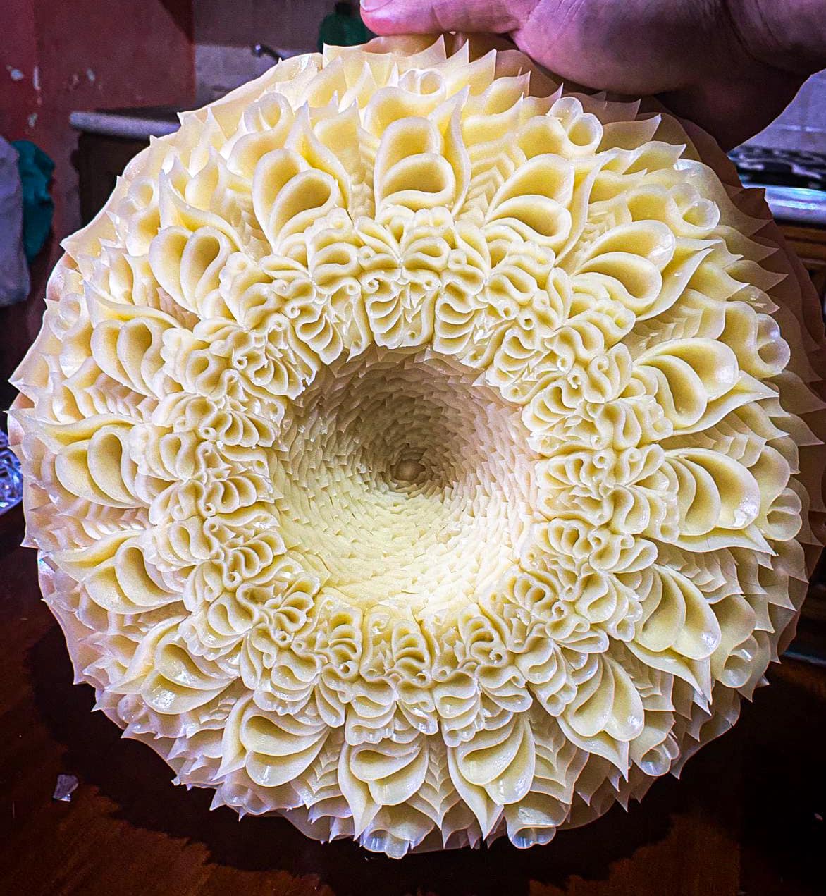 «L’intaglio del formaggio, con la sua delicatezza e precisione» scrive Giuseppe Guida in un post, «riflette la complessità della mente di un artista, dove ogni incisione è un pensiero, ogni dettaglio una visione che prende forma nel caos della creatività».