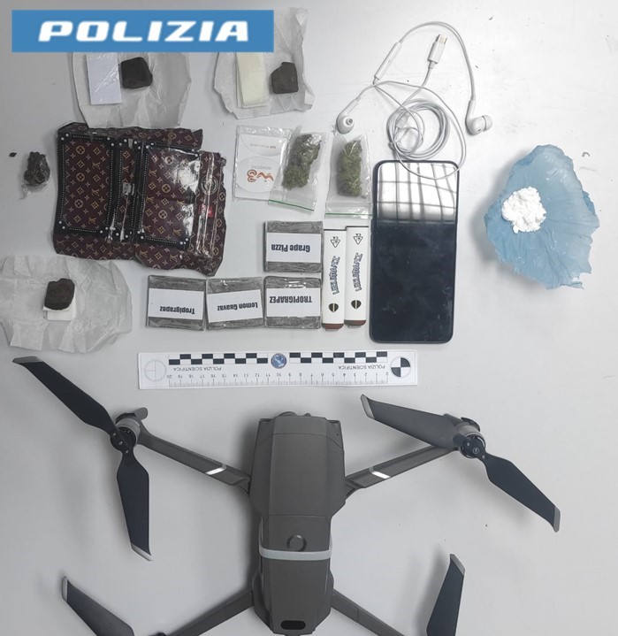 A poche centinaia di metri dal carcere, tra la folta vegetazione, i poliziotti della Squadra Mobile hanno recuperato un drone di medie dimensioni, al quale era stato legato con una lenza un piccolo pacchetto di plastica con all’interno 4 panetti di hashish per un peso complessivo di circa 100 grammi, tre dosi preconfezionate di marijuana e un piccolo involucro con 4 grammi circa di cocaina oltre ad un smartphone completo di auricolari e scheda SIM.