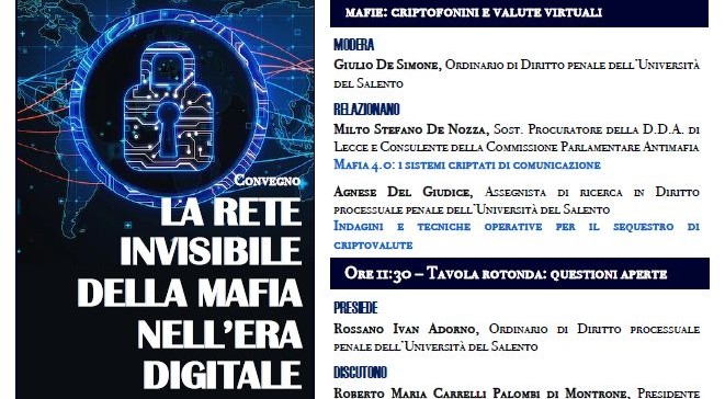 Nel corso del convegno, saranno esaminate e approfondite le nuove frontiere investigative in tema di intercettazioni di comunicazioni criptate e di tracciamento, identificazione e sequestro di criptovalute. A questa particolare sessione dei lavori – moderata dal professor Giulio De Simone, ordinario di Diritto penale di UniSalento – prenderanno parte Milto Stefano De Nozza, pubblico ministero della Direzione Distrettuale Antimafia di Lecce e consulente della Commissione parlamentare antimafia; Agnese Del Giudice, assegnista di ricerca di Diritto processuale penale del nostro ateneo.