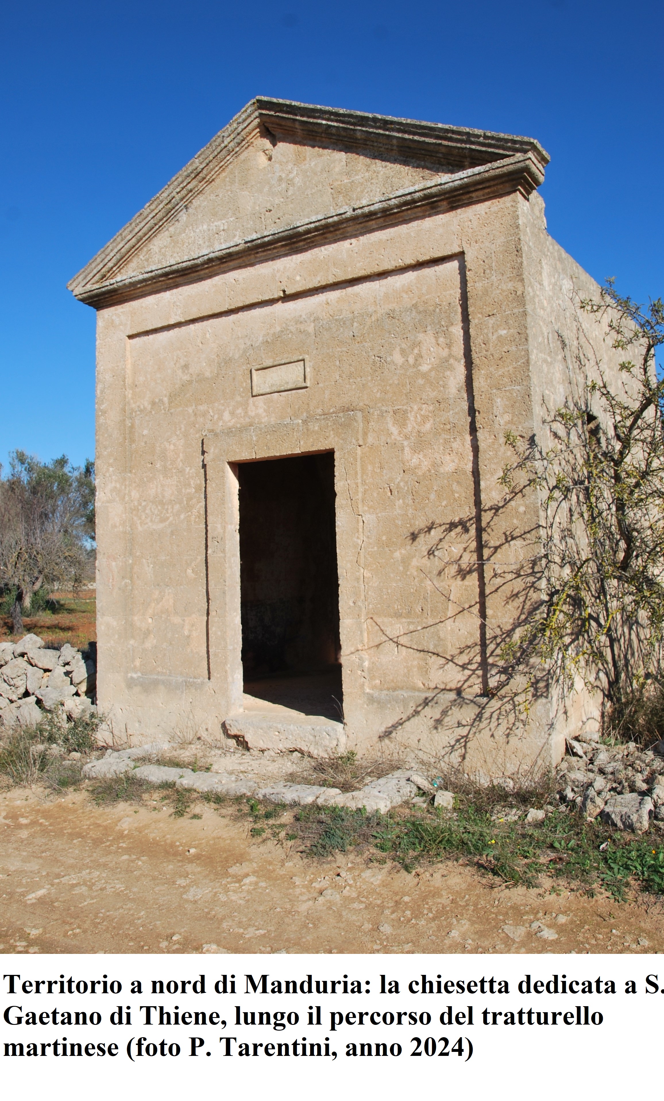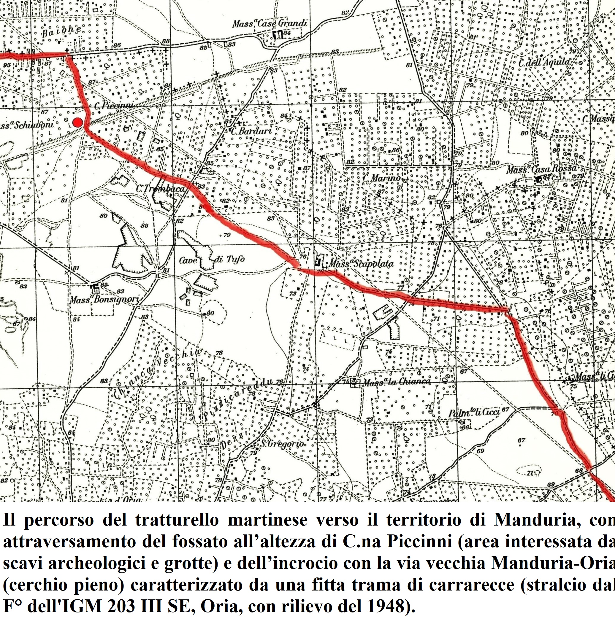 Stradoni e carraie toccano anche il versante centro-occidentale del vallone (Casina Piccinni), ove, a breve distanza ad ovest delle grotte e dell’area di scavo, si nota (o, meglio, si notava) una fitta concentrazione di assi carrai, oggi all’interno di una proprietà privata delimitata da alto muro di recinzione. Siamo, in questo tratto del fossato, all’incrocio tra la via vecchia Manduria-Oria (staccatasi dalla via vecchia Manduria-S. Cosimo poco prima di masseria Bonsignori) e il percorso dell’antico tratturello martinese proveniente dai territori murgiani più interni (Castellaneta, Mottola, Martina, Grottaglie); tratturello oggi segnato da una strada campestre che, nel suo percorso meridionale (verso il territorio di Manduria - Avetrana e poi il litorale dell’Arneo), dopo aver superato il fossato, lambisce, a non eccessiva distanza dal vallo, la chiesetta o, meglio, la cappella rurale dedicata a S. Gaetano di Thiene (prospiciente una vasta area cavata) e la successiva masseria Scapolata (con chiesetta esterna ed antica torre merlata protetta da caditoie), in avanzato stato di abbandono