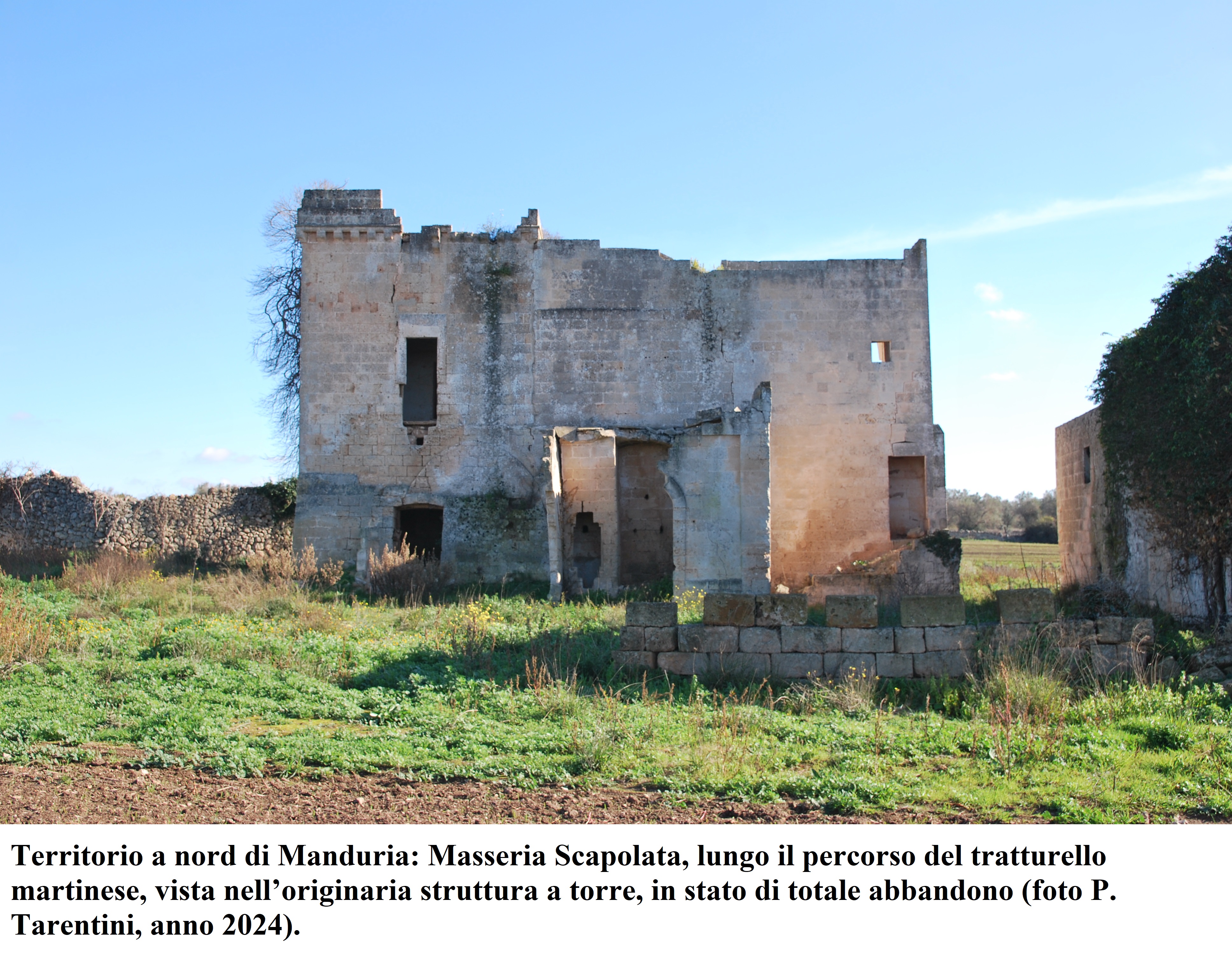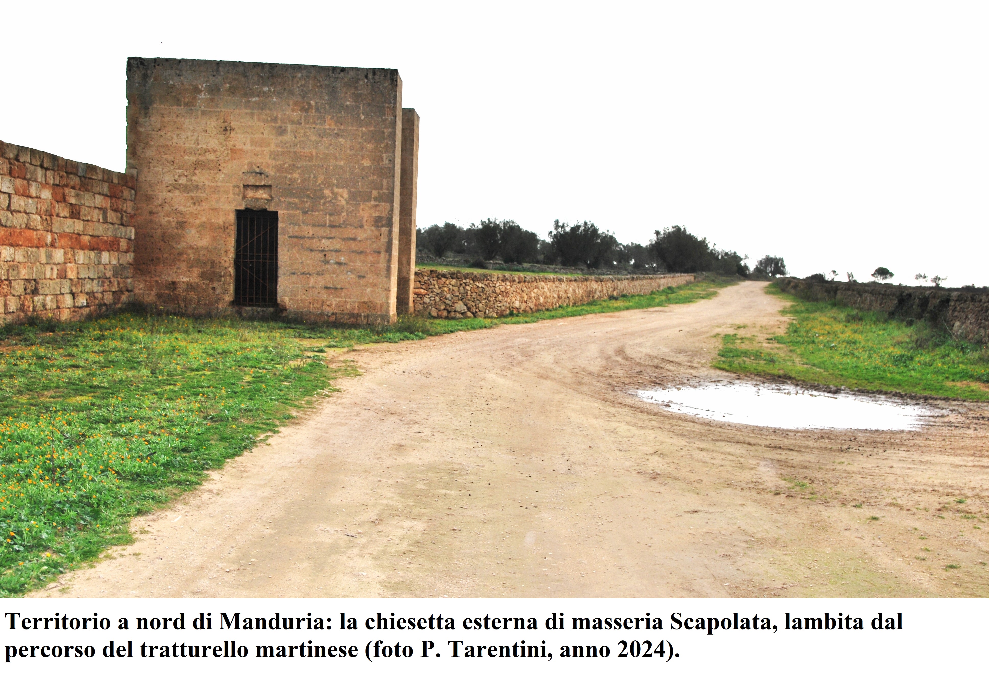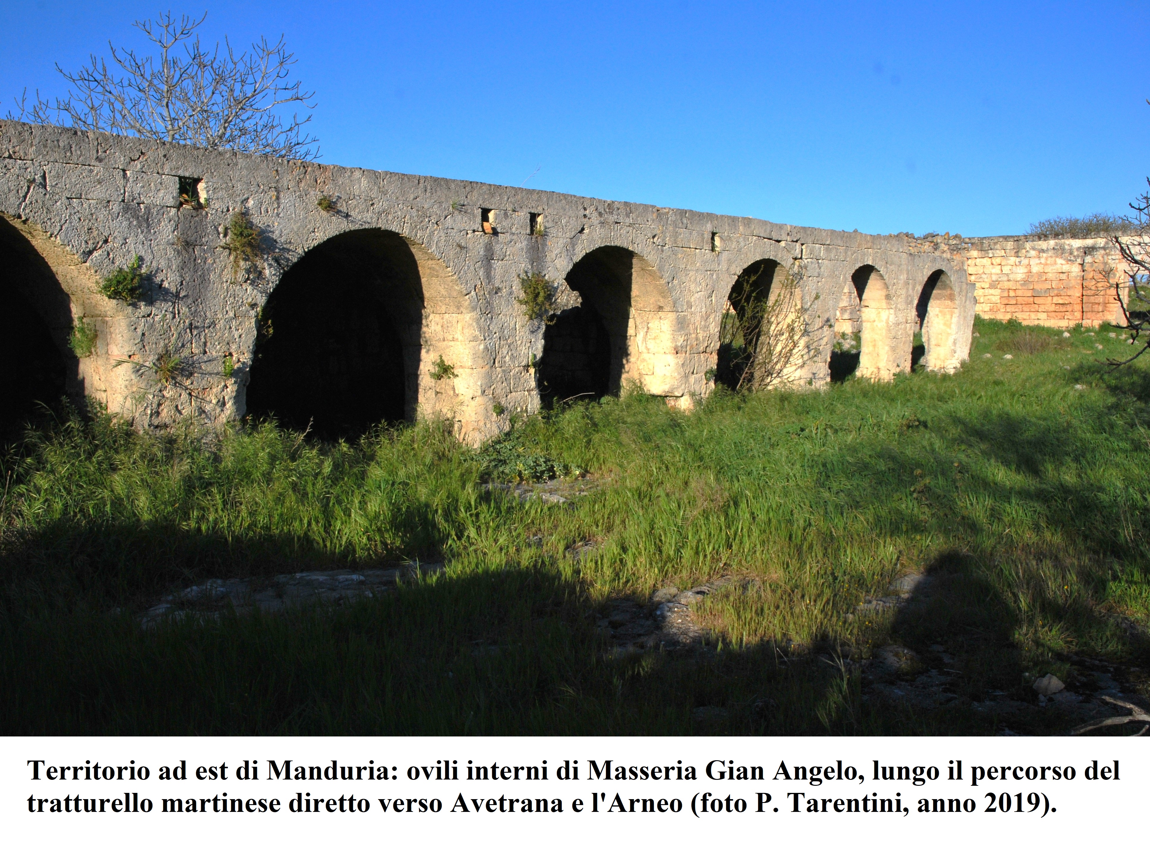 Superata Masseria Scapolata, lo stradone prosegue, attraverso il territorio di Masseria Cicci, verso la strada statale Manduria-Lecce, che oltrepassa agevolmente (grazie anche ad un sottopasso ferroviario, forse appositamente realizzato) in direzione delle Masserie Eredità e Lo Monte. Il tragitto successivo conduce decisamente a sud, verso Masseria Giannangelo e Masseria Ruggianello, attraversando una fascia territoriale frequentata in epoca preistorica, greco-romana e medievale (vedi P. TARENTINI, Manduria, ricerche topografiche ad est dell’abitato, in G. CARDUCCI (a cura di), Liber amicorum. Miscellanea di studi storici offerti a Rino Contessa, vol. II, Manduria, Filo, 2003, pp. 993-1012). Non sorprenda questo collegamento con siti archeologici limitrofi, in quanto tratturi e tratturelli hanno spesso rappresentano, fin da epoche remote, assi importantissimi per contatti ed interscambi economici tra i vari settori territoriali attraversati.