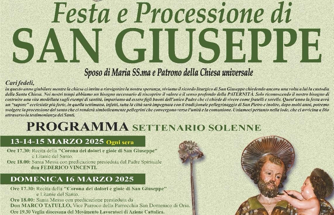 Domani, 19 marzo, si celebra la festa in onore di San Giuseppe.Ecco il programma delle celebrazioni religiose.
