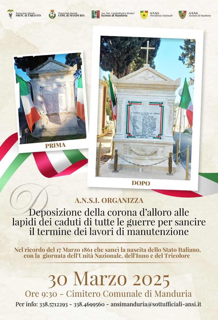 L’Associazione Nazionale Sottufficiali d’Italia di Manduria onora coloro che hanno sacrificato la loro vita per la nostra bandiera presso il cimitero comunale di Manduria il 30 marzo, alle ore 9.30, con la deposizione di una corona d’alloro al monumento ossario dedicato ai Caduti di tutte le guerre.