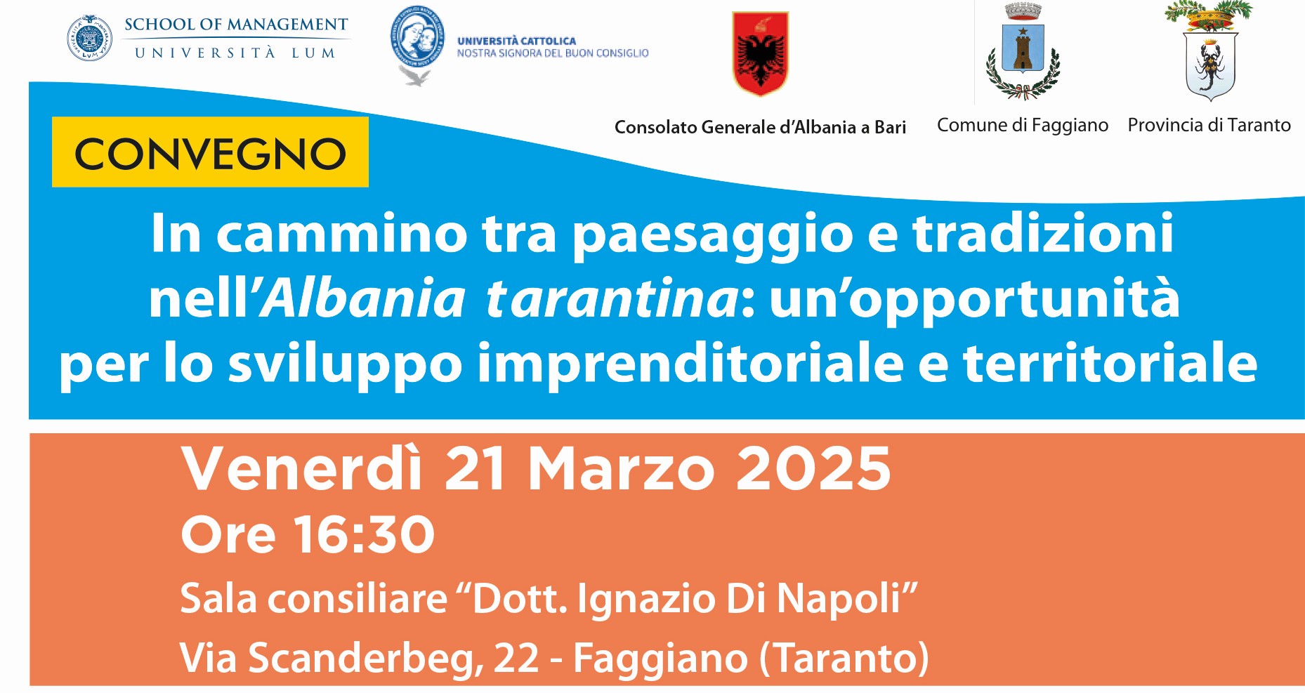 Il convegno si propone di esplorare, in modo multidisciplinare e con riferimento ai comuni dell’Albania tarantina, il ruolo delle tradizioni e dal paesaggio anche per la promozione dello sviluppo imprenditoriale e territoriale.