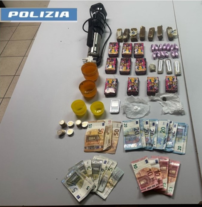 Dalla perquisizione domiciliare, i poliziotti hanno recuperato nella cucina, all’interno di un ovulo di plastica, tre grammi circa di cocaina, tre grammi di hashish, un bilancino di precisione ancora intriso delle sostanze stupefacenti appena recuperate e numerosi ritagli di cellophane bianco utilizzati per il confezionamento delle dosi.