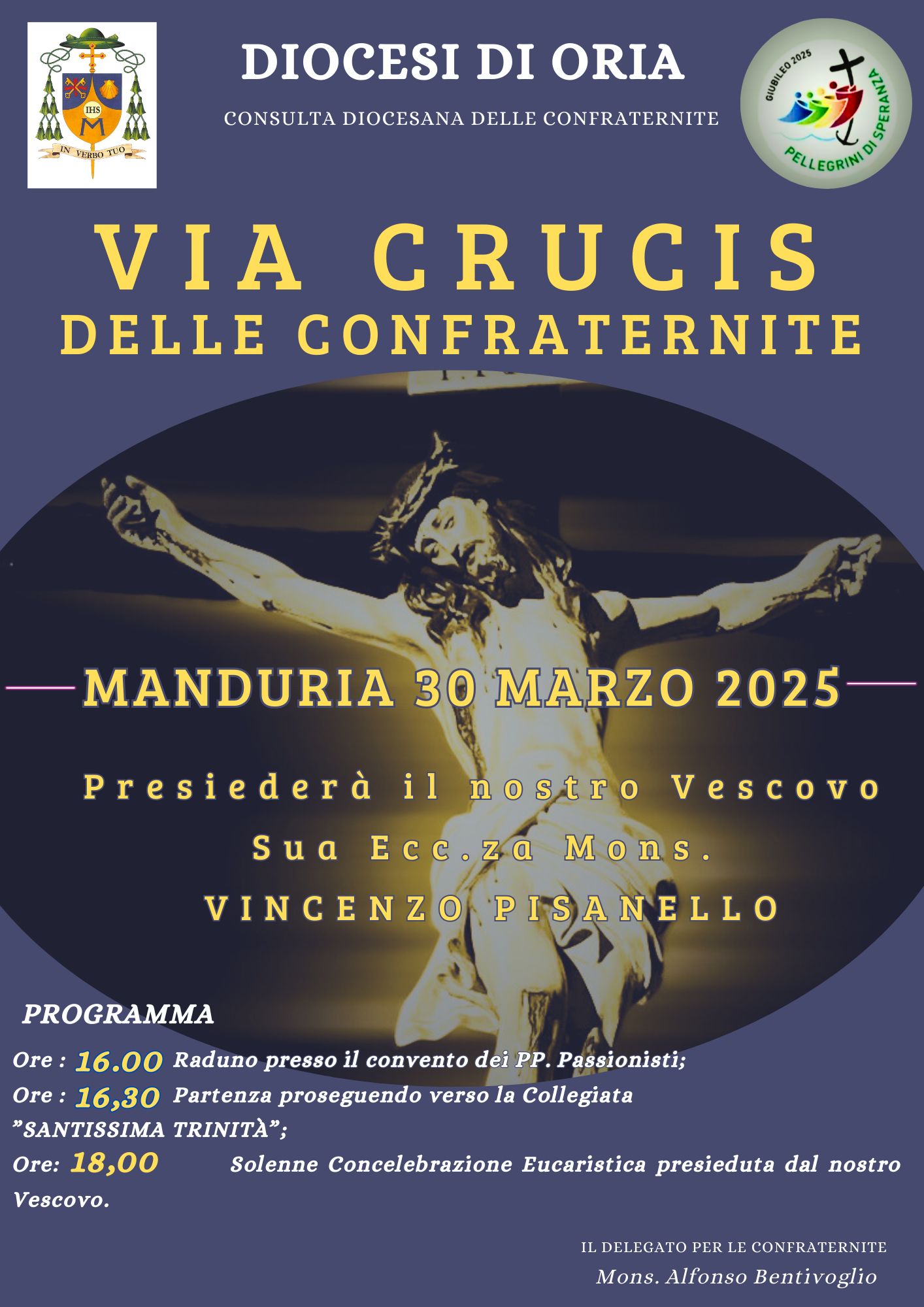 Domenica 30 marzo, la città di Manduria ospiterà la consueta Via Crucis delle Confraternite della Diocesi di Oria, presieduta dal vescovo mons. Vincenzo Pisanello.