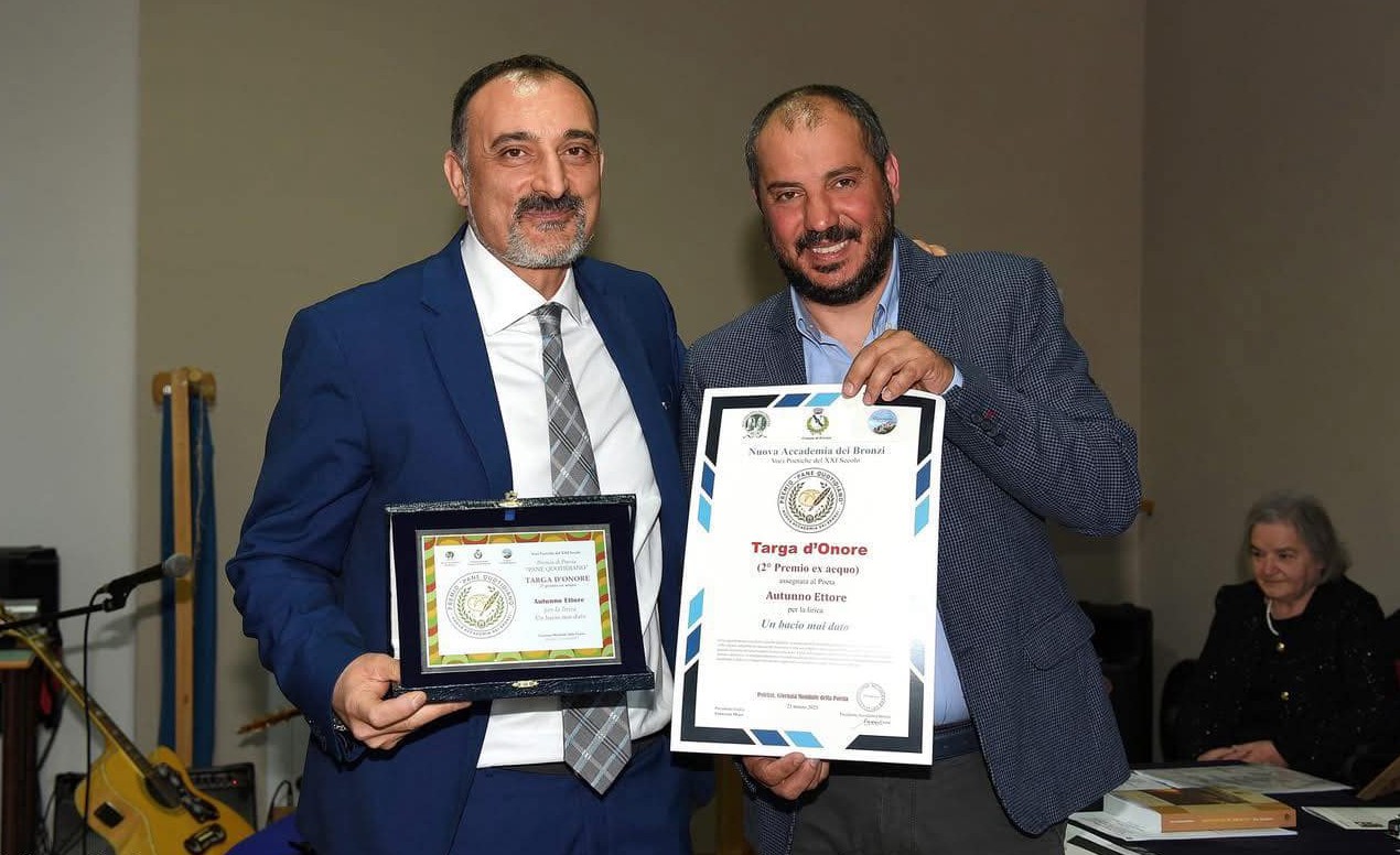 Fra i premiati, Ettore Autunno. La giuria (di cui faceva parte anche il presidente della Nuova Accademia dei Bronzi Vincenzo Ursini) e la presidente, nonché poetessa, Francesca Misasi, hanno selezionato e premiato la lirica “Un bacio mai dato” di Ettore Autunno una targa d’onore e con il secondo posto ex aequo. Oltre ad “Un bacio mai dato”, un’altra lirica di Ettore Autunno sarà pubblicata nel volume “Pane Quotidiano”, che sarà distribuito gratuitamente a 50 biblioteche Italiane dalla Nuova Accademia dei Bronzi: si tratta di “In un amore infinito”.