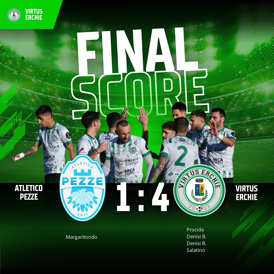 Pronostico rispettato in quel di Fasano nell’incontro fra Atletico Pezze e Virtus Erchie. La capolista si è imposta con il punteggio di 4-1, grazie alla doppietta di Bruno Denisi (giunto a quota 27 nella classifica dei marcatori) e alle reti di Procida e Salatino (entrambi a quota 10 fra i cannonieri).