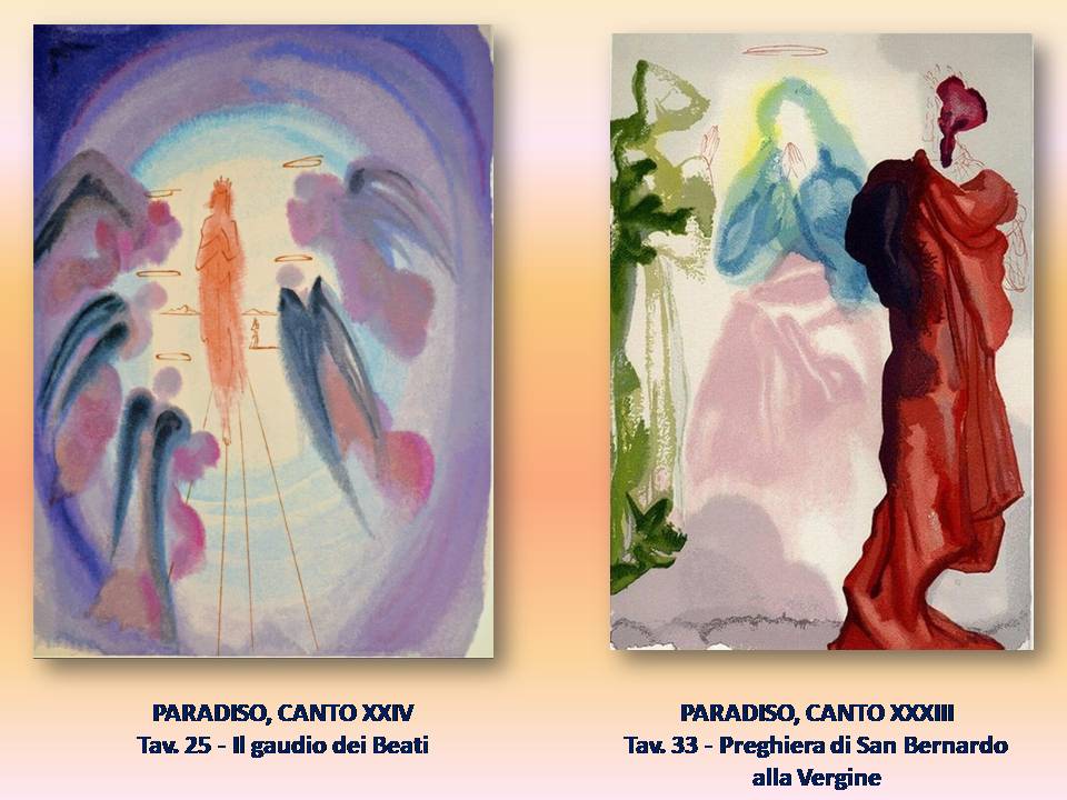 È così nell’Inferno, cromaticamente «rischiarato dal sole e dal miele del Mediterraneo» (è lo stesso Dalì a dirlo) e popolato da figure solitarie di contro all’oscurità e alla folla dell’interpretazione figurativa tradizionale. È così nel Purgatorio, con la spiaggia deserta e «surreale» dove si fermano Dante e Virgilio. È così, infine, nel Paradiso, dove la trasfigurazione dei personaggi li rende figurativamente e cromaticamente evanescenti, celestiali finanche nelle fattezze fisiche: un esempio su tutti, la delicatissima raffigurazione di Beatrice.