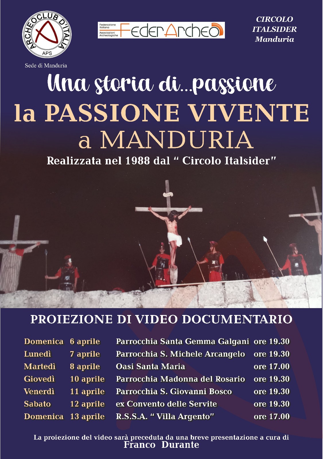 «Si trattò di dipendenti, operai e quadri dell’Italsider, che vollero dare all’omonimo circolo della città messapica una valenza non solo ludica, ma anche culturale, realizzando un evento che, oltre ad impegnarli personalmente, potesse coinvolgere tutta la comunità» è riportato in una nota di Archeoclub Manduria. «Per alcuni mesi, dunque, questi lavoratori dedicarono il loro tempo libero a distribuire i ruoli, a provare e riprovare scene, ad individuare i vari luoghi della città dove collocarle, a stabilire percorsi, a richiedere autorizzazioni, a far realizzare abiti, a ricercare il materiale utile per le varie scenografie, a scegliere le musiche, insomma a provvedere alle tante cose necessarie affinché l’evento della Passione potesse essere rappresentato al meglio, in tutta la sua valenza sacra. Grazie a Franco Durante, di tutto questo impegno, protrattosi sino agli anni ’90, si è conservata memoria ed ora viene riproposto ai Manduriani per mezzo della proiezione di un video, tra quelli realizzati allora, e di una mostra, in collaborazione con Archeoclub, di cui parleremo in seguito.