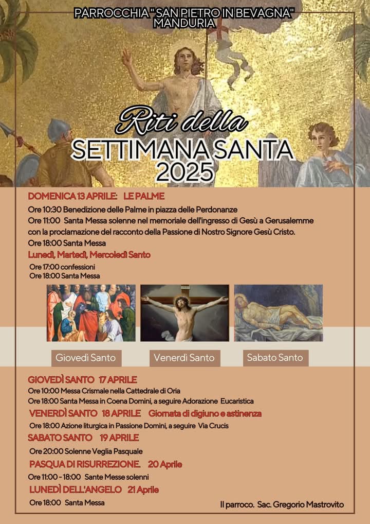 Ecco il programma dei riti della Settimana Santa della parrocchia di San Pietro in Bevagna, così come approntato dal parroco, il sacerdote Gregorio Mastrovito