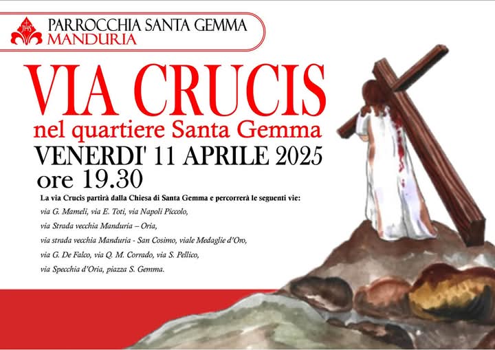 Ore 19,30 – La via Crucis partirà dalla chiesa di Santa Gemma e percorrerà le seguenti vie: via Mameli, via Toti, via Napoli Piccolo, via strada vecchia Manduria-Oria, via strada vecchia Manduria-San Cosimo, viale Medaglie d’Oro, via De Falco, via Corrado, via Pellico, via Specchia d’Oria, piazza Santa Gemma.