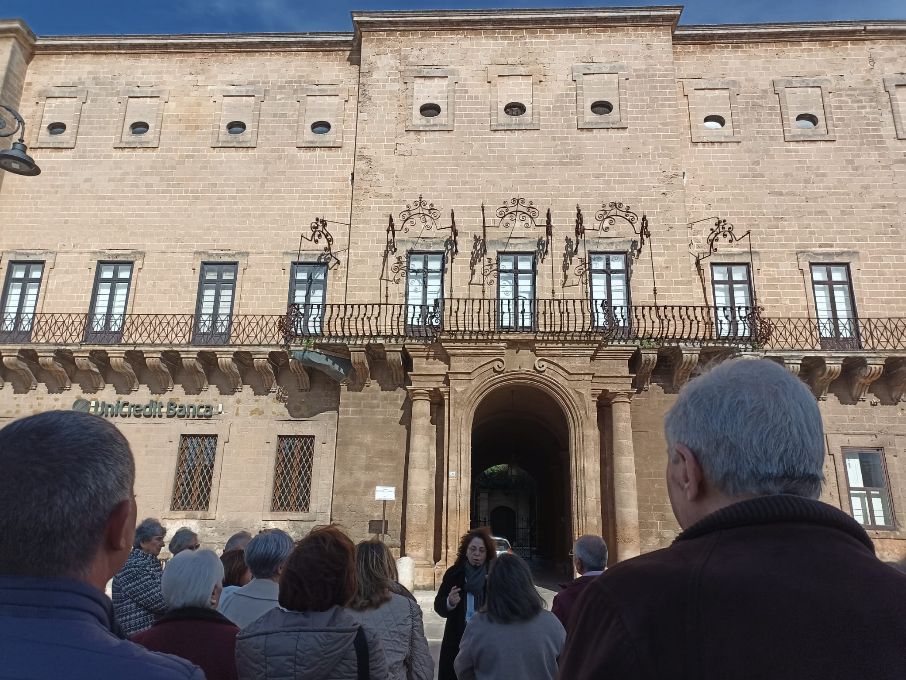 Con la ormai usuale guida della dott.ssa Angela Greco, e approfittando dalla cortese ospitalità e disponibilità dell’arch. Nino Filotico, la visita si è articolata in un approccio storico e descrittivo della struttura, della sua splendida scalinata e di alcuni ambienti del Palazzo.