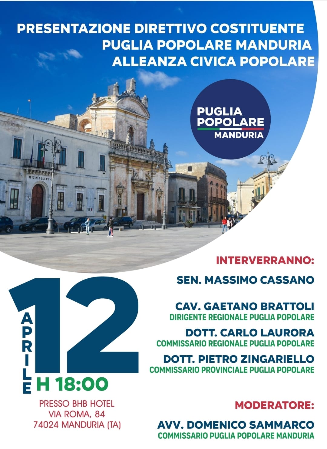 La presentazione ufficiale del nuovo direttivo, momento cruciale e inaugurale dell’attività politica locale di Puglia Popolare, si terrà sabato 12 aprile alle ore 18, presso la sala riunioni dell’hotel BHB in via Roma 84. Interverranno il sen. Massimo Cassano, il dirigente regionale di Puglia Popolare Gaetano Brattoli, il commissario regionale di Puglia Popolare Carlo Laurora e il commissario provinciale di Puglia Popolare Pietro Zingariello. Modererà i lavori Domenico Sammarco, commissario di Puglia Popolare a Manduria.