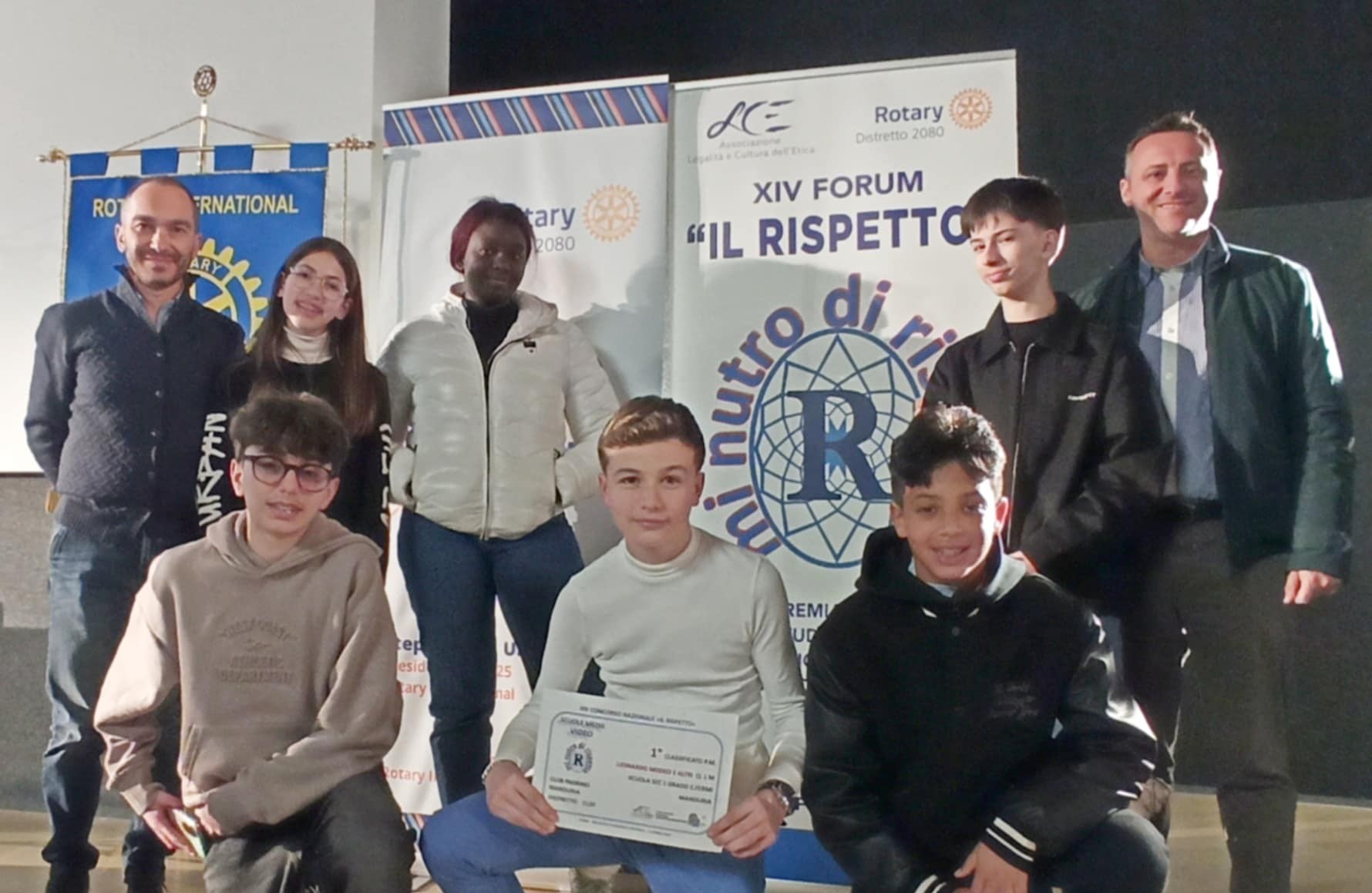 Per la scuola secondaria “Enrico Fermi” di Manduria arriva un altro riconoscimento nazionale. Oggi gli alunni del comprensivo Don Bosco (Leonardo Modeo, Maty Kasse, Oscar Cappelli, Pietro Lamusta, Francesco Capone e Ludovica M. Greco) sono volati a Roma per ritirare il 1° Premio del XIV Concorso Nazionale “Legalità & Cultura dell’Etica”, promosso dal Rotary Distretto 2080, con quello di Manduria in qualità di club padrino.
