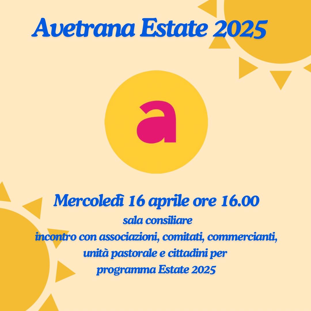 L’Amministrazione comunale ha convocato per mercoledì 16 aprile, alle ore 16, presso la sala consiliare del Comune di Avetrana, l’incontro con associazioni, comitati, commercianti, Unità Pastorale e cittadini che intendono organizzare iniziative all’interno del cartellone estivo 2025 di Avetrana.