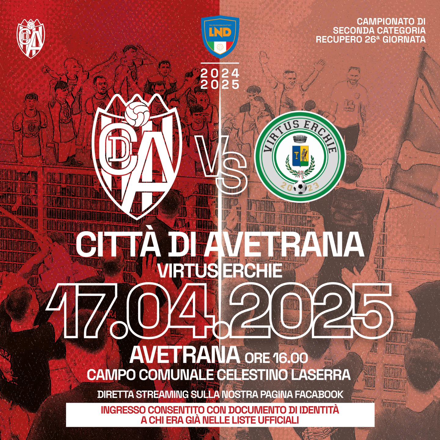 Giovedì, alle 16, il recupero della partita Città di Avetrana-Virtus Erchie al “Celestino Laserra”: si ripartirà dall’11° minuto, con il risultato di 0-0.