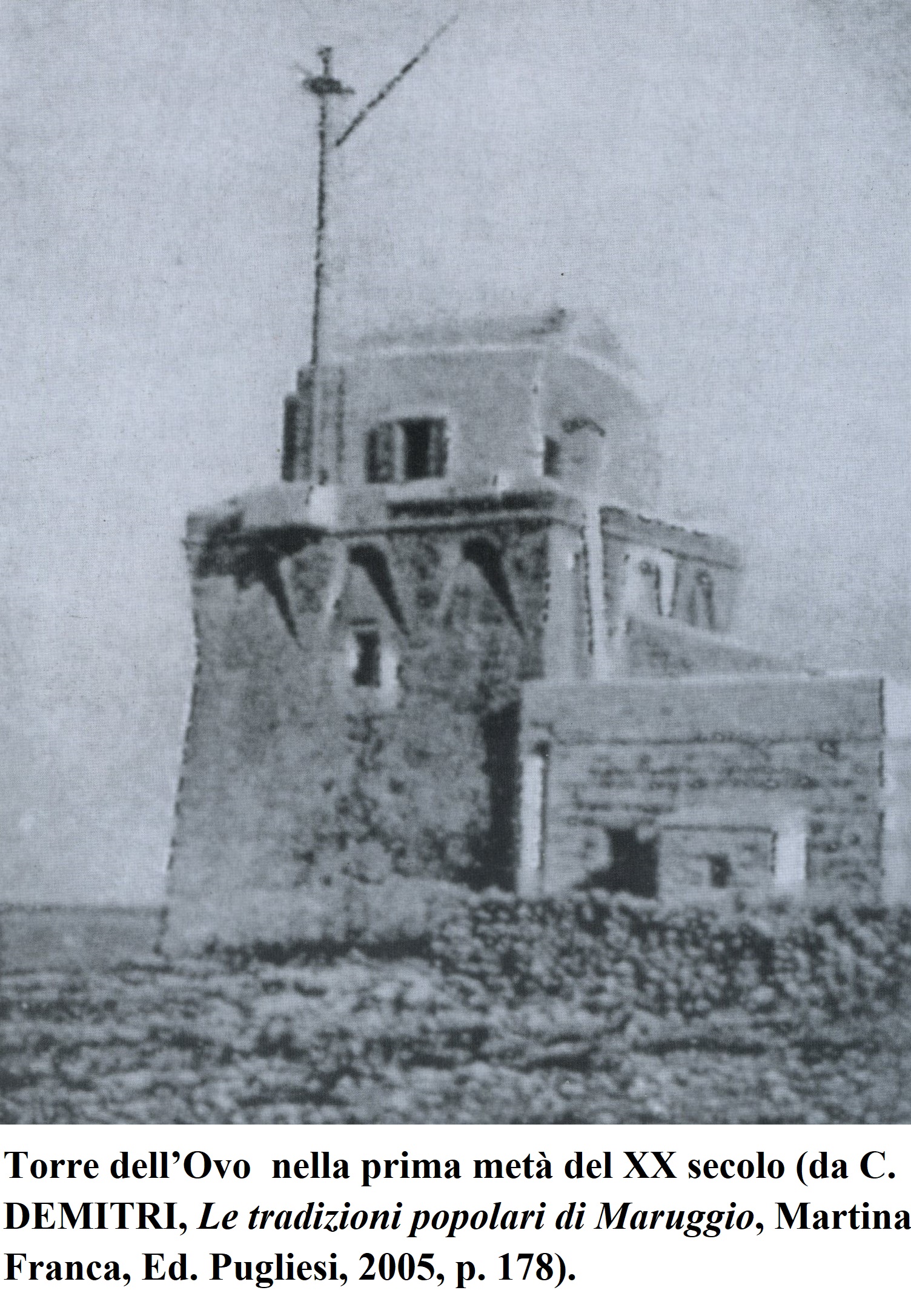 Cessata la pirateria nel Mediterraneo intorno al primo trentennio dell’Ottocento (caduta di Algeri, 1830) le torri e le difese costiere furono pian piano dimesse. La nostra torre, segnalata ancora in buone condizioni nel 1825 (P. COCO, vol. cit., p. 93), nel 1842 risulta in uso delle Guardie Doganali (M. SCALZO, Torre Ovo, cit., p. 115). Durante la prima guerra mondiale fu utilizzata come postazione logistico-militare, (B. ANTONELLI - T. FILOMENA, Il relitto della Madonnina. Storia di una nave militare greca del IV sec. a.C. naufragata nel mare di Maruggio (Taranto), Manduria 2004, p. 82), mentre casamatte e camminamenti ancora visibili nelle vicinanze rimandano al secondo conflitto mondiale. In epoca post bellica risulta adibita a faro di segnalazione; faro ancora attivo, a mia memoria, agli inizi degli anni Sessanta, di cui ricordo ancora, da bambino, i fasci di luce, sferzanti ed improvvisi, che illuminavano le serate estive in una Torre Ovo ancora buia e poco frequentata, con alcuni trulli interni e radi gruppi di casette affacciate sul litorale. Negli anni 1968-1969 la torre avrebbe ospitato alcuni membri di una spedizione archeologica della Marina americana (Trocmorton Exspedition dell’Università di Pensylvania) venuti ad esplorare il mare del “monte dell’Ovo” (vedi T. FILOMENA, Guida a Maruggio dentro e oltre la storia, Manduria, Tiemme, 2006, p. 55).