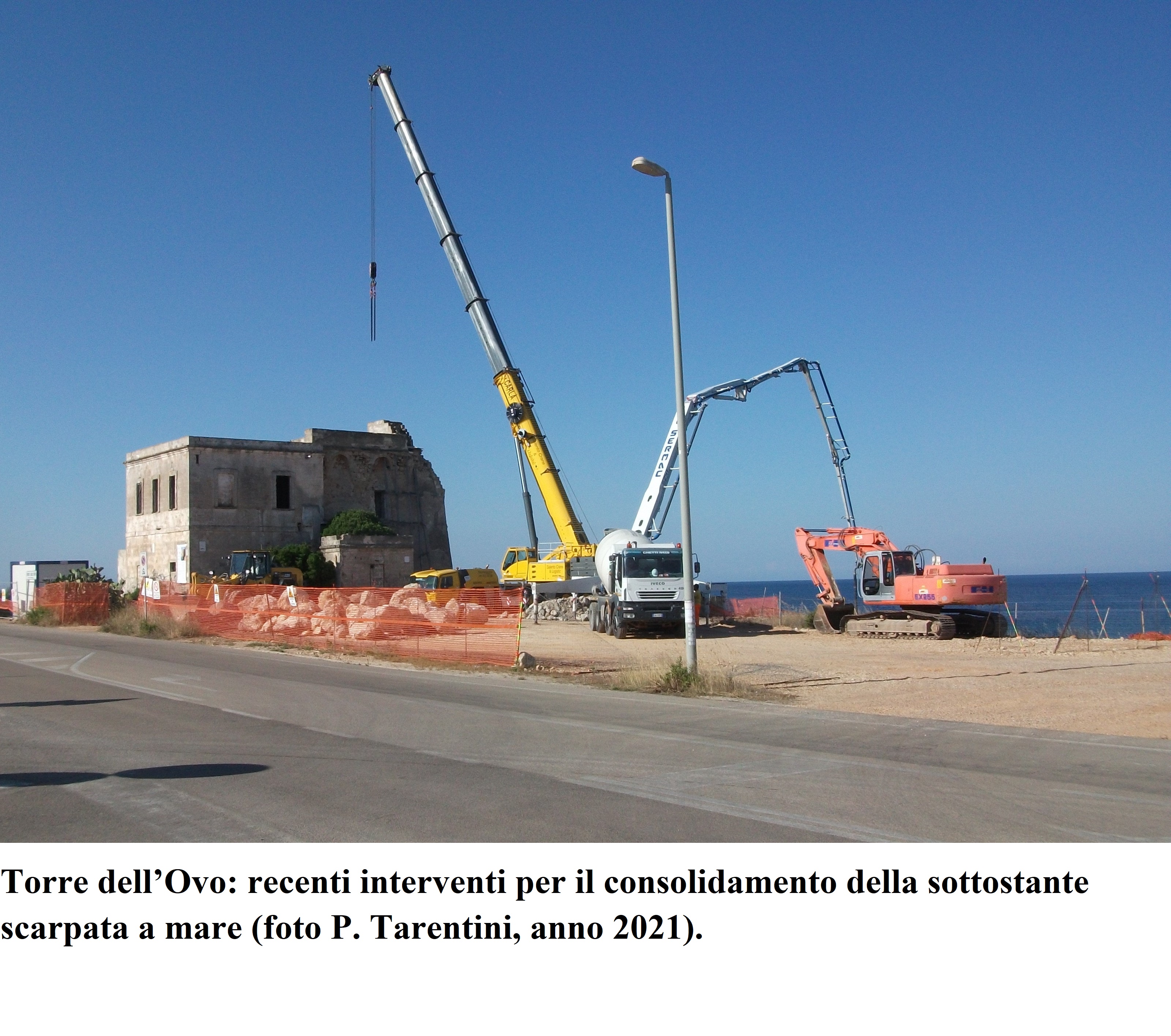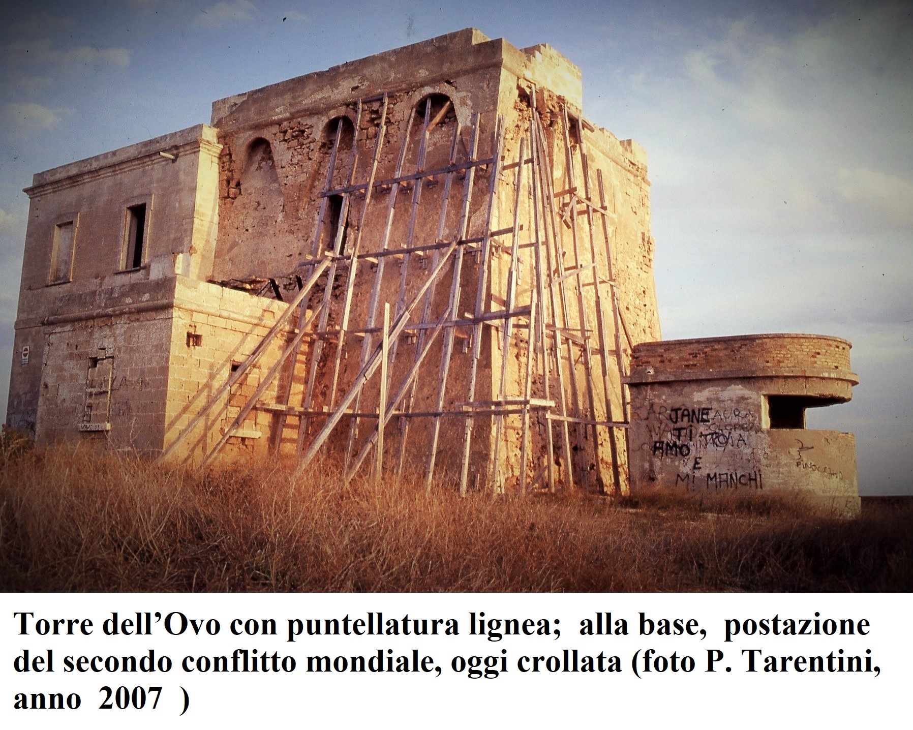Poi un lento ed inarrestabile declino, fino all’attuale degrado, appena contenuto da una puntellatura lignea realizzata nell’anno 2004, circa. Degrado che i prossimi interventi potranno arrestare, a tutela e salvaguardia di un impianto proteso su un tratto di mare e di litorale frequentati fin dalla Preistoria, per i vantaggi di tipo economico, commerciale ed insediativo da sempre offerti (vedi P. TARENTINI, Torre dell’Ovo. Un litorale antico tra Torricella e Maruggio (TA), Manduria 2015).