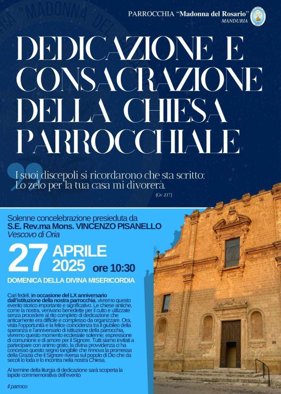 «Cari fedeli, in occasione del 60° anniversario dell’istituzione della nostra parrocchia, vivremo questo evento storico importante e significativo» scrive nel manifesto il parroco don Federico Vincenti. «Le chiese antiche, come la nostra, venivano benedette per il culto e utilizzate senza procedere al rito completo di dedicazione che anticamente era difficile e complesso da organizzare.