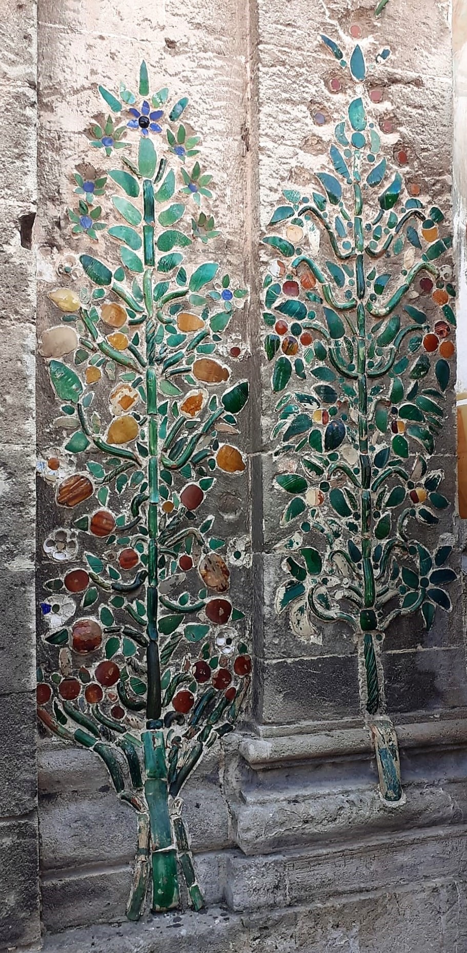 Egli questuò cocci di bottiglie, di piatti, di specchi, di boccali e di cristalli, con cui decorò le croci, componendo una sorta di mosaico, al quale la policromia dei materiali utilizzati conferisce, da sempre, un effetto sorprendente e unico. Il maestro Greco, ricostruendo accuratamente quanto riportato nei vangeli, addossò alle collinette piccole costruzioni, la casa di Anna, di Caifas, il palazzo di Pilato, il tempio di Gerusalemme, il tribunale di Erode. Vi aggiunse, inoltre, sparsi qua e là, il busto di un angelo, una fontana, il pozzo della Samaritana, le figure di Giuda, di Giuseppe d’Arimatea, di Nicodemo. Passò poi a scavare due piccole vasche, ponendovi in una le anguille, le tartarughe nell’altra, mentre sotto la tomba di Cristo Morto (sulla quale si legge ‘Giardini di Eden ove peccò Adamo’), costruì l’Eden, collocandovi le statue di Adamo ed Eva. Furono infine dipinti sul muro alle spalle del complesso quattro affreschi, che l’arciprete Gatti nominò rispettivamente ‘Col bacio Giuda il suo Signor tradisce’, ‘Cede Pilato —il Redentor condanna’, Sull’Agnello divino l’empio infierisce’, ‘Gesù al grave incarco affanna’. Fece infine realizzare il muro di cinta e il cancello di ferro.