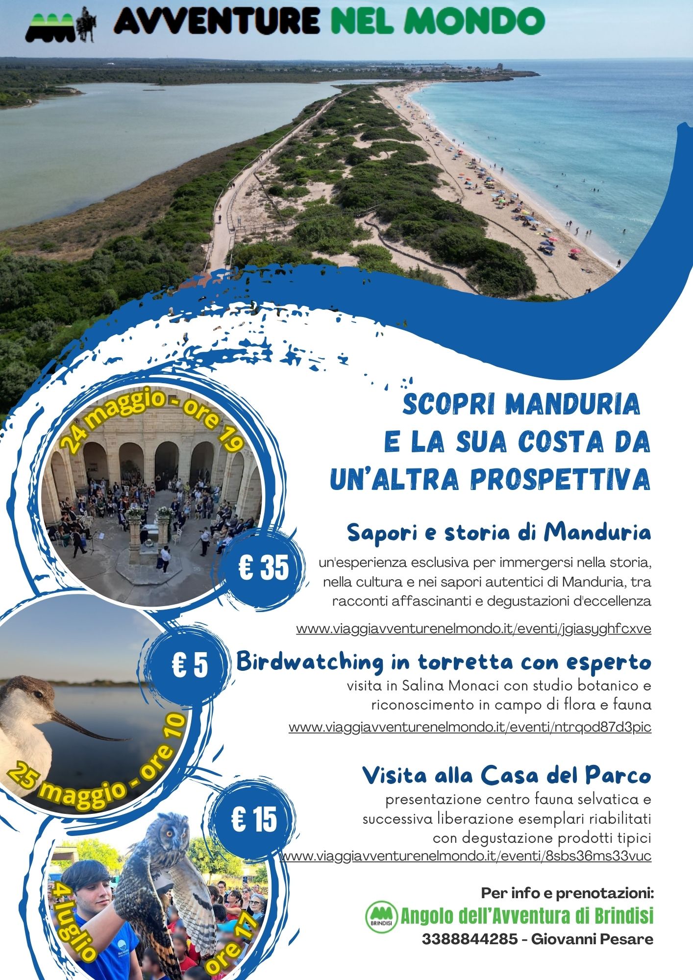 Anche il territorio di Manduria è coinvolto grazie alla sinergia con associazioni ed enti locali. Sono stati programmati, infatti, tre eventi molto interessanti: “Sapori e Storia di Manduria. Un viaggio tra tradizione e gusto” (24 maggio), un'esperienza esclusiva per immergersi nella storia, nella cultura e nei sapori autentici della nostra città, tra racconti affascinanti e degustazioni d'eccellenza con il valido appoggio della cooperativa Spirito Salentino; “Birdwatching in torretta con esperto” (25 maggio), visita in Salina Monaci con studio botanico e riconoscimento in campo di flora e fauna; “Visita alle collezioni della Casa del Parco” (4 luglio), presentazione centro fauna selvatica e successiva liberazione esemplari riabilitati con degustazione prodotti tipici, entrambi organizzati con il supporto e l’ospitalità delle Riserve naturali litorale tarantino orientale.