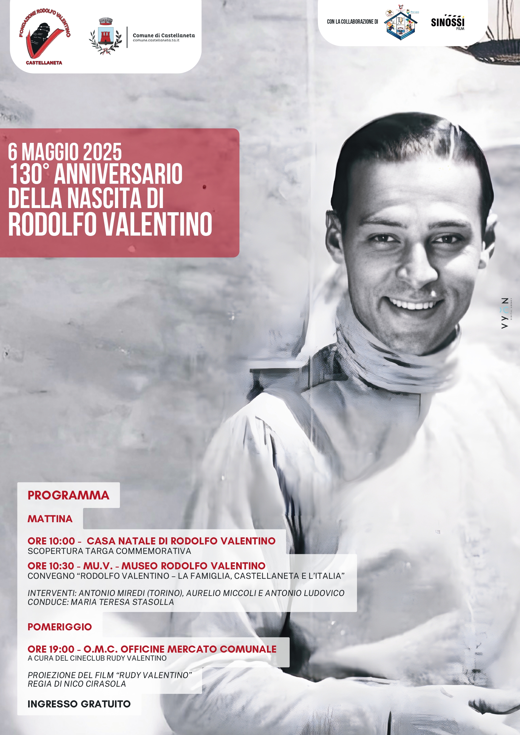 In occasione del 130° anniversario della nascita di Rodolfo Valentino, il primo divo del cinema e icona di fascino e seduzione (si ispirarono a lui per coniare il termine ‘latin lover’), nato a Castellaneta il 6 maggio 1895, la Fondazione Rodolfo Valentino e il Comune di Castellaneta, in collaborazione con Domus Futura e l’Associazione Sinossi Film, hanno organizzato per martedì 6 maggio le iniziative per celebrarlo e tenere in vita la sua memoria; alle ore 10, nei pressi della casa natale di Rodolfo Valentino, scopertura targa commemorativa; alle ore 10:30, nel MU.V Museo Rodolfo Valentino, si terrà il convegno “Rodolfo Valentino – la famiglia, Castellaneta e l’Italia” con interventi dei proff.ri Antonio Ludovico, Aurelio Miccoli e Antonio Miredi, e la conduzione della prof.ssa Maria Teresa Stasolla; alle ore 19, nelle O.M.C. Officine Mercato Comunale, con ingresso libero, è in programma la proiezione del film “Rudy Valentino - Divo dei divi” di Nico Cirasola a cura del Cine Club “Rudy Valentino”.