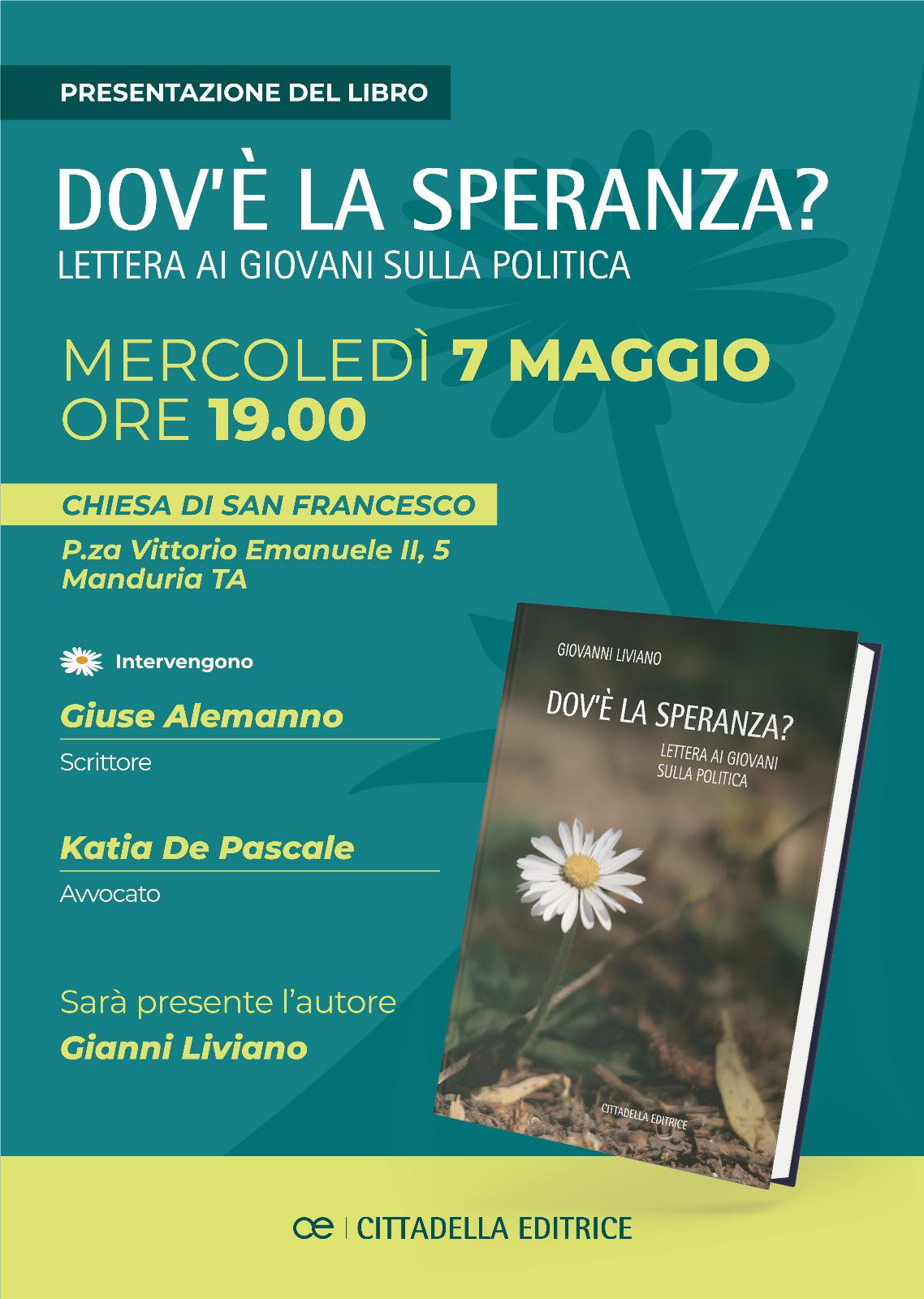 Mercoledì 7 maggio, alle ore 19, nella chiesa di San Francesco, la presentazione del libro “Dov’è la speranza” di Gianni Liviano.