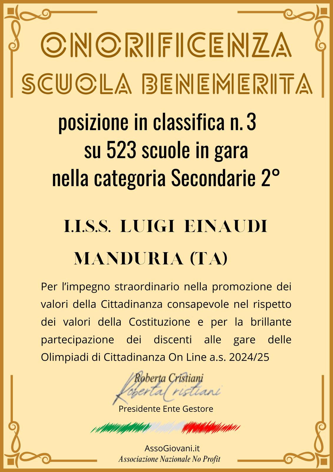 Un traguardo che riempie d’orgoglio l’intera comunità scolastica: l’istituto “Luigi Einaudi” di Manduria ha conquistato il terzo posto a livello nazionale nella categoria delle scuole secondarie di secondo grado alle Olimpiadi di Cittadinanza Online, promosse dall’associazione nazionale AssoGiovani per l’anno scolastico 2024/25.