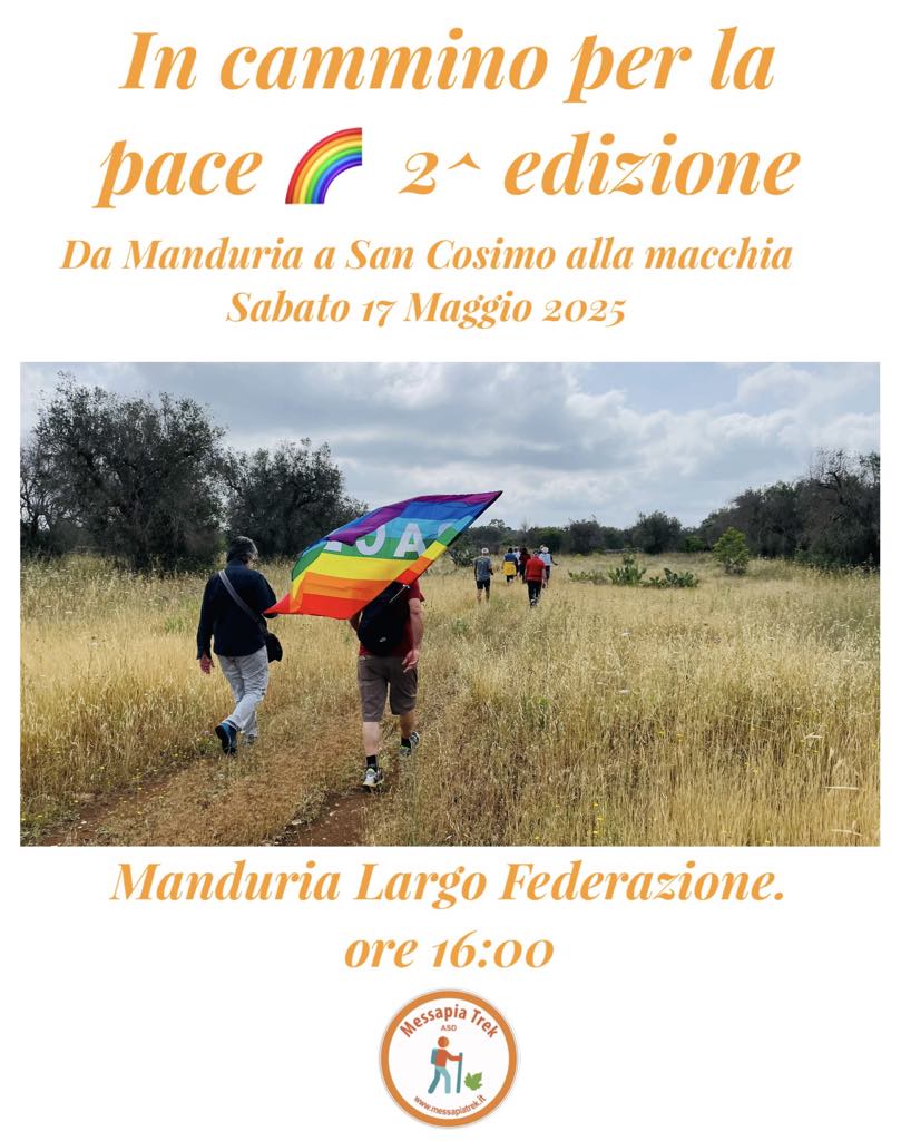 Come sempre ribadiamo la necessità di abbassare le armi e di dar voce al dialogo alla aggregazione per raggiungere finalmente una pace duratura ed uno stop di tutte le guerre. Il cammino è sempre lo stesso, da Manduria al Santuario di San Cosimo alla macchia attraverso i tratturi e le strade di una volta, tutti insieme, associazioni, movimenti e gruppi di amici, riuniti insieme in una marcia sotto l’unica bandiera arcobaleno, per promuovere un messaggio di speranza. L’arrivo al Santuario è previsto per le ore 18:30 circa, all’interno del quale i partecipanti che lo desiderano, potranno liberamente dedicare un momento di preghiera». Appuntamento dunque per sabato 17 maggio, alle ore 16, presso il Largo Federazione, nei pressi dei Produttori di Manduria.