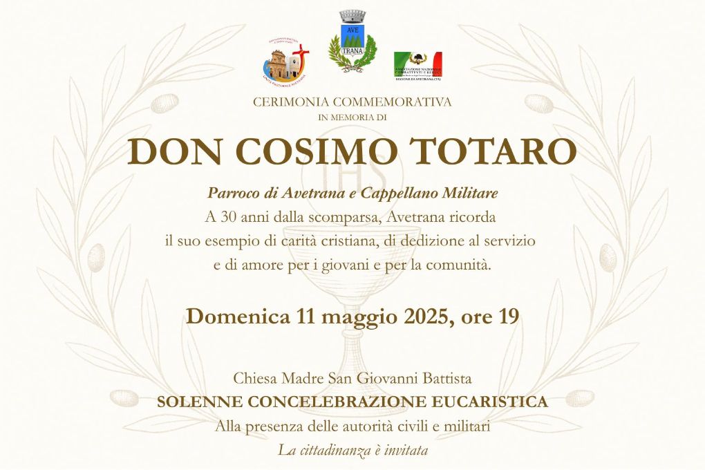 L’Amministrazione Comunale di Avetrana invita tutta la cittadinanza a partecipare alla commemorazione in memoria di don Cosimo Totaro, già parroco di Avetrana e cappellano militare, in occasione del 30° anniversario della sua scomparsa.