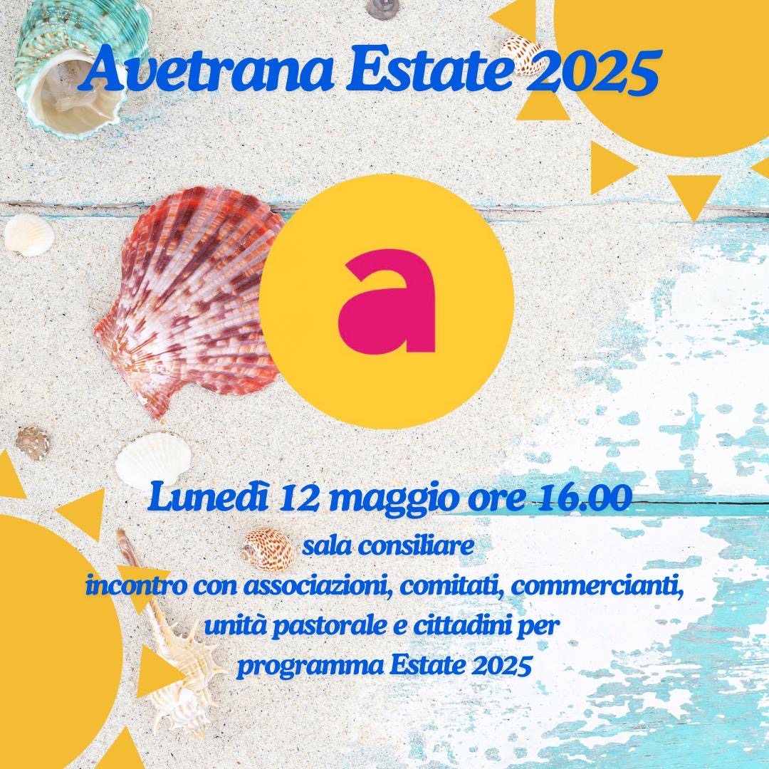 Continua il confronto per costruire insieme il programma di Avetrana Estate 2025. Si svolgerà lunedì 12 maggio, alle ore 16, l’incontro con le associazioni, unità pastorale, comitati, commercianti e cittadinanza attiva.